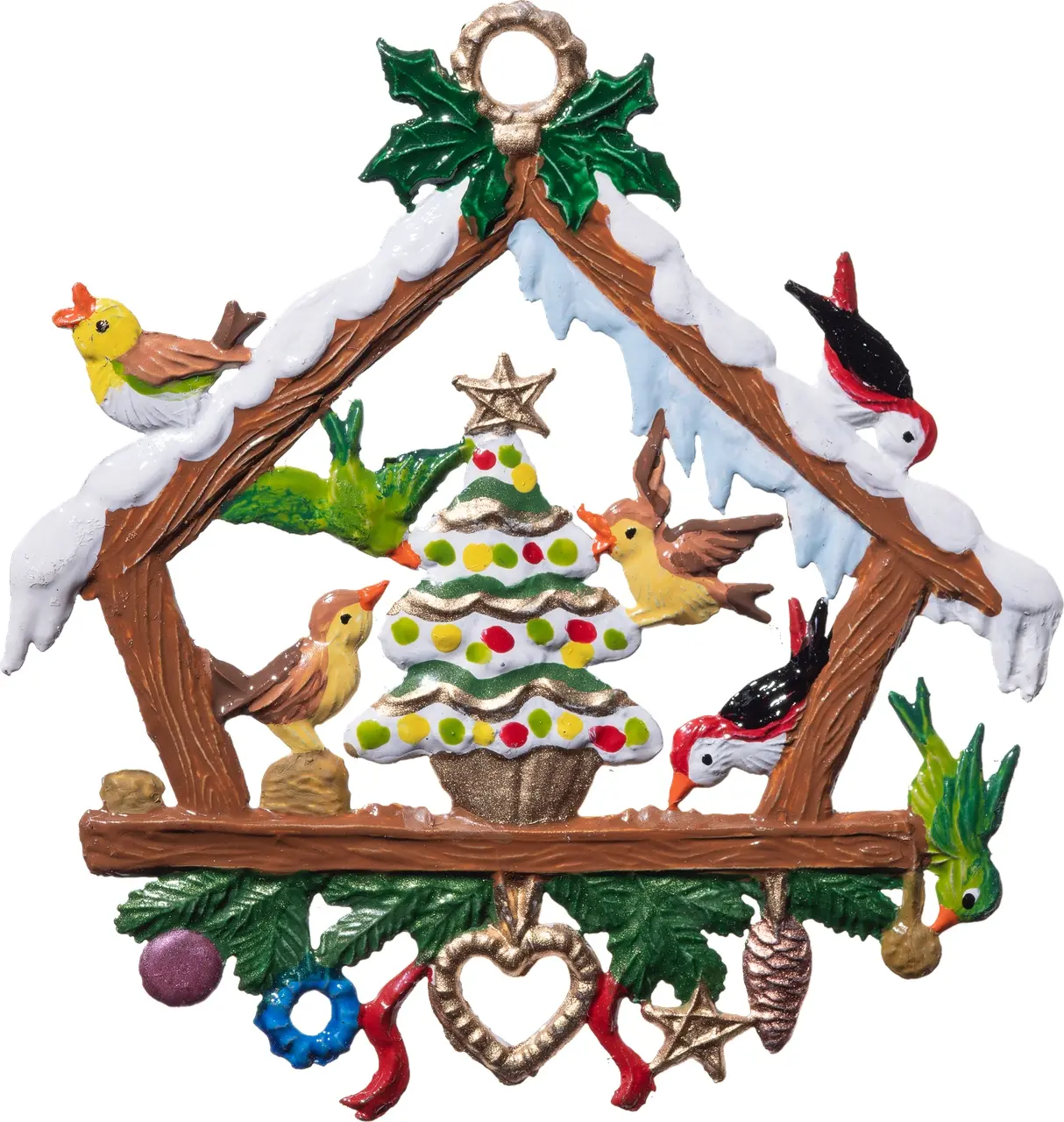 6 x 6 cmVerleihen Sie Ihrem Weihnachtsbaum einen Hauch von Natur mit diesem entzückenden Baumbehang. Liebevoll detailliert, zeigt diese kleine Szenerie eine friedvolle Versammlung gefiederter Freunde, umgeben von winterlichen Motiven und feierlichen Dekorationen. Ein glänzender Stern krönt das kompakte Kunstwerk, während kunstvoll gestaltete Verzierungen den festlichen Glanz vervollständigen. Ideal für Sammler und als charmantes Geschenk zur Weihnachtszeit.