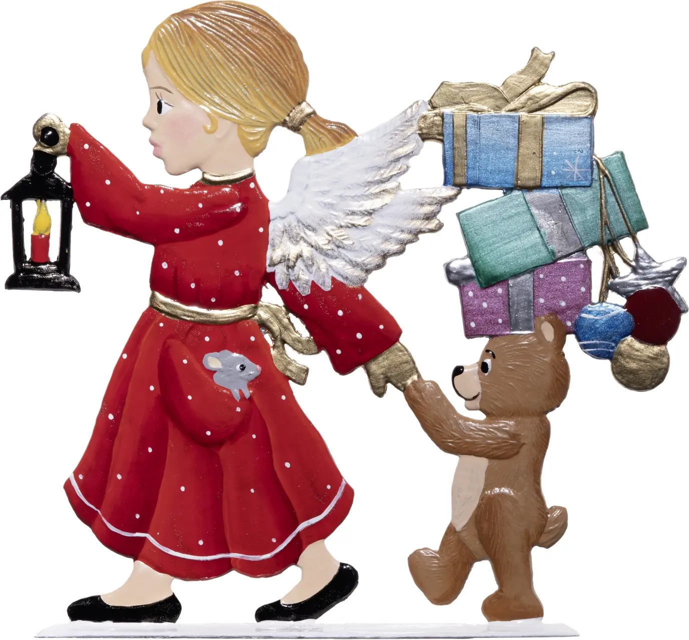 8 x 8 cmVerzaubern Sie Ihr Heim mit einem Hauch von festlicher Magie! Diese entzückende Zinnfigur zeigt eine frohe Szene, in der ein fleißiger kleiner Bär einem Engel hilft, bunt verpackte Gaben zu tragen. Der Engel, in festlicher Stimmung, führt den Weg mit einer Laterne, die sanft den Pfad erleuchtet. Perfekt geeignet als charmanter Blickfang am Weihnachtsabend oder als liebevolles Geschenk. Mit Liebe zum Detail handgefertigt, bringt dieses kleine Kunstwerk die Essenz der Weihnachtsfreude in jedes Zuhause. Ideal für Sammler und als festliche Dekoration.